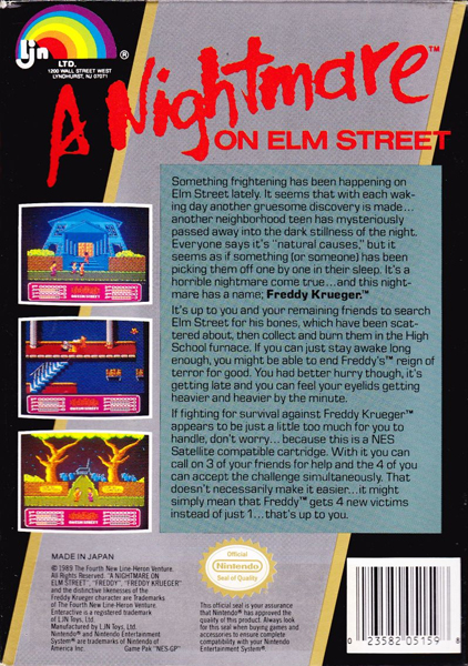 A Nightmare on Elm Street is a 1989 Nintendo Entertainment System video game based on Wes Craven's slasher film of the same name. Rare created the game, which was released by LJN.