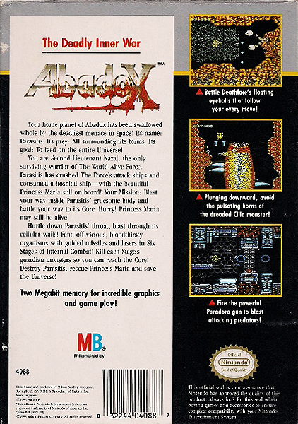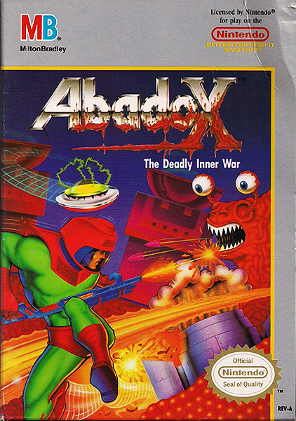Abadox: The Deadly Inner War is a video game for the Nintendo Entertainment System that was released in Japan by Natsume in 1989 and in North America by the Milton Bradley Company in 1990. It's a horizontally scrolling shooter in the spirit of Gradius and R-Type that takes place within a massive extraterrestrial organism's digestive tract.