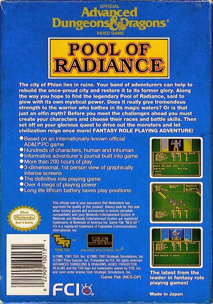The city of Phlan lies in ruins. Your band of adventurers can help to rebuild the once-proud city and restore it to its former glory. Along the way you hope to find the legendary Pool of Radiance, said to glow with its own mystical power. Does it really give tremendous strength to the warrior who bathes in its magic waters? Or is that just an elfin myth? Before you meet the challenges ahead you must set off on your glorious quest to drive out the monsters and let civilization reign once more! FANTASY ROLE PLAYING ADVENTURE! - Based on an Internationally-known official AD&D PC game - Hundreds of characters, human and inhuman - Informative adventurer’s journal built into game - More than 200 hours of play - 3-dimensional, 1st person view of graphically intense screens - The definitive role playing game - Over 4 Megs of playing power - Long life lithium battery saves play positions