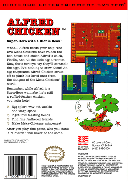 Alfred Chicken is a Nintendo Entertainment System and Game Boy video game released in North America, Europe, and Japan by Mindscape in 1993. The American edition of the game included a special Alfred Chicken poster.