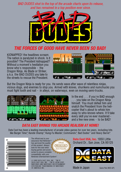 Bad Dudes Vs. DragonNinja, usually known simply as Bad Dudes or DragonNinja, is a 1988 arcade side-scrolling cooperative beat 'em up game created and distributed by Data East. It was also ported to a number of computer and video game console home systems.