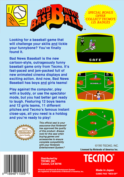 The Bad News Baseball is a baseball game for the Nintendo Entertainment System that was initially released in Japan as Gekit!! Stadium. Players' objective is to defeat every other team in the game. The game might go on endlessly until this happened.