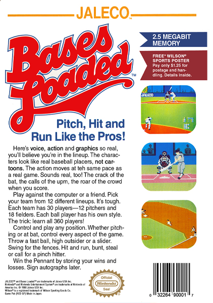 Bases Loaded, also known as Moero in Japan!! Pro Yaky is a baseball video game developed by Jaleco and released for the Nintendo Entertainment System. It was first released in Japan in 1987 and in North America in 1988, with a Game Boy port following in July 1990. There is also a mobile phone version.