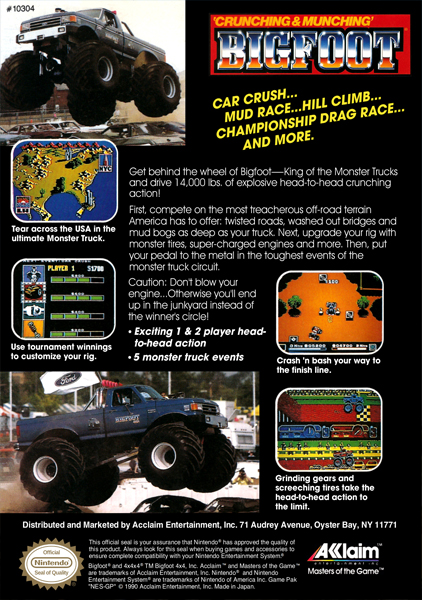 Bigfoot is a racing video game released in July 1990 for the Nintendo Entertainment System. It was developed by Beam Software and published by Acclaim. The game was advertised by the legendary monster truck of the same name in the cartoon segment of the 1990 television show, Video Power, titled The Power Team. The show also often used sound effects for the actions of not only Bigfoot, but others as well.