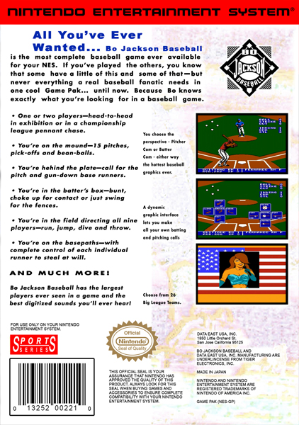 Baseball video game Bo Jackson Baseball is available for the Nintendo Entertainment System, Amiga, TurboGrafx-16, and MS-DOS. It stars athlete Bo Jackson, who was a professional baseball star at the time and is now a former NFL player.