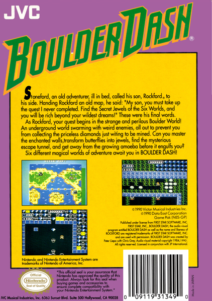 Boulder Dash is a video game that was released for a variety of platforms including the Commodore 64, Atari 400/800, ZX Spectrum, NES, IBM PC, Amstrad CPC, and others. It is also a rare game case released for the game room after being published on home platforms.
