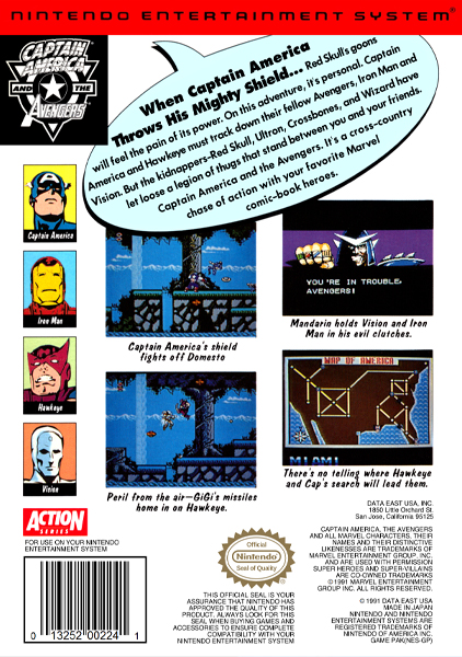 Captain America and the Avengers is an arcade game developed and released by Data East in 1991. It features the Marvel Comics characters The Avengers in a side-scrolling brawling and shooting adventure to defeat the evil Red Skull. The game received ports for the Sega Genesis/Mega Drive, Super Nintendo Entertainment System, Game Boy and Game Gear. A different Data East game was released for the Nintendo Entertainment System.