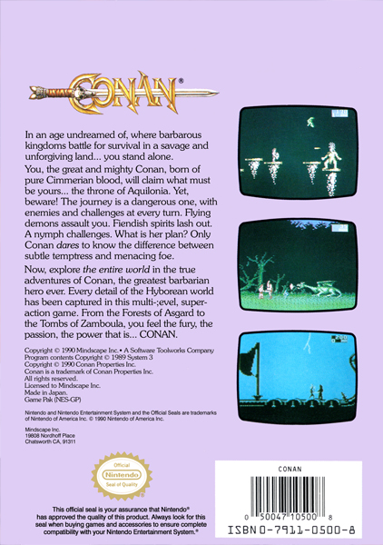 A side-scrolling action video game called Conan, also referred to as Conan: The Secrets of Time, was released in 1991 for the Nintendo Entertainment System. Mindscape created and distributed it. It is a straightforward version of System 3's Myth: History in the Making computer game, despite the fact that it stars Conan the Barbarian.