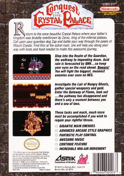 Conquest of the Crystal Palace, also known as Matendji in Japan, is a Nintendo Entertainment System platform game released in 1990 by Asmik Corporation of America.