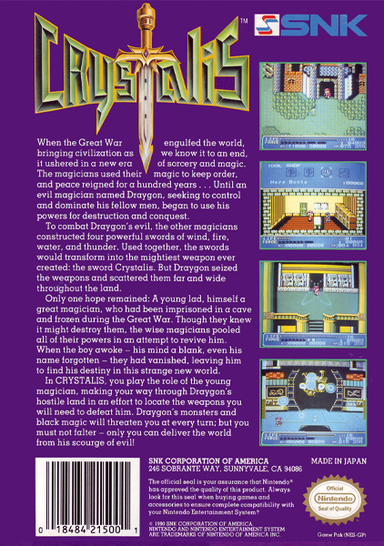 Crystalis, originally released in Japan as God Slayer: Haruka Tenkū no Sonata, is a 1990 action RPG/action-adventure video game produced by SNK for the Nintendo Entertainment System.
