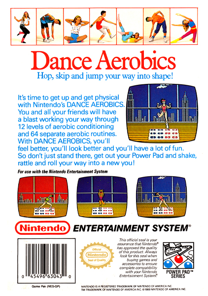 Dance Aerobics, released in Japan as Aerobics Studio is a music video game published in February 1987 by Bandai as the third game in Bandai's Family Trainer series. It was designed for use with NES' 3x4 dance mat, the Power Pad, making it similar to the rhythm game genre - a genre that would later explode into the mainstream gaming market at the tail end of the 1990s. Dance Aerobics was published in Japan by Bandai and in North America by Nintendo.