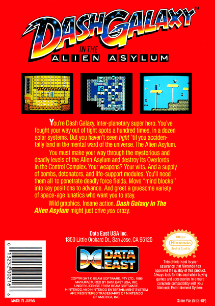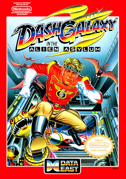 Dash Galaxy in the Alien Asylum is an action game for the Nintendo Entertainment System, developed by Beam Software and published by Data East, released in 1990 exclusively in North America.