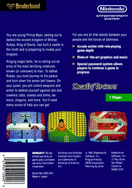 Action role-playing video game Deadly Towers was created by Lenar and has been exclusively licensed by Irem for the Nintendo Entertainment System (NES). On December 15, 1986, it was made available in Japan; the next year, in September, it was made available in North America. Deadly Towers was a top seller in 1987 and one of the first role-playing video games for the NES to be released in North America.