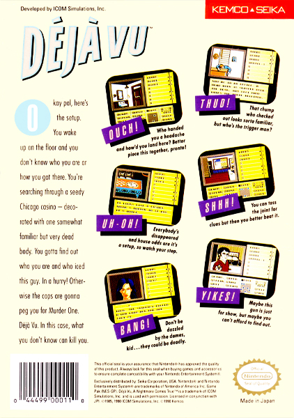 A point-and-click adventure game called Déjà Vu is set in the 1940s hardboiled detective genre of books and films. The first in the MacVenture series, it was launched in 1985 for the Macintosh and then ported to a number of other platforms, including the Amiga.