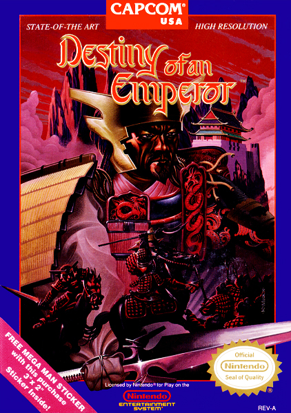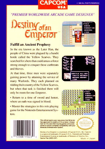 Destiny of an Emperor literally "The Devouring of Heaven and Earth" is a strategy role-playing game by Capcom for the Nintendo Entertainment System. It was originally released in Japan in 1989, with an English language localization released for the North American market in 1990.