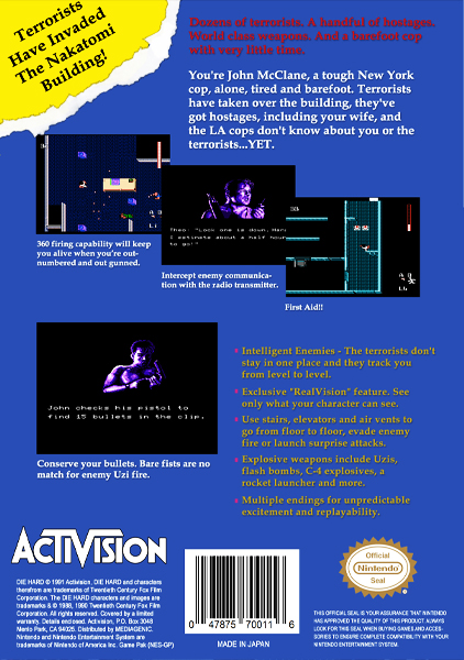 Die Hard is the name of three video games produced by Activision in 1990 for the Commodore 64, 1990 for the TurboGrafx-16, and 1991 for the NES. Its gameplay is based on the same-named 1988 film.