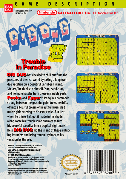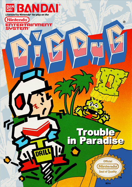 Dig Dug II, subtitled Trouble in Paradise for Bandai's American NES port, is the arcade sequel to Dig Dug, released by Namco in 1985. It runs on Namco Super Pac-Man hardware but with a video system like that used in Mappy, The Tower of Druaga and Grobda (without the DAC). The only home version of the game was for the NES, which Bandai released in Japan on April 18, 1986 and in North America during 1989.