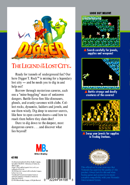 Digger T. Rock: Legend of the Lost City is a platform video game developed by Rare and published by the Milton Bradley Company for the Nintendo Entertainment System. It was first released in North America in December 1990 and in Europe in 1991. The game centres around the miner Digger T. Rock, as he spelunks various caves and catacombs whilst searching for the mythical Lost City.