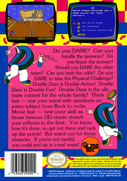 Double Dare is a video game published by GameTek and based on the Nickelodeon game show Double Dare. The game was originally released by for DOS computers in 1988. It was ported to the Nintendo Entertainment System (NES) by Rare and re-released for the system in 1990.