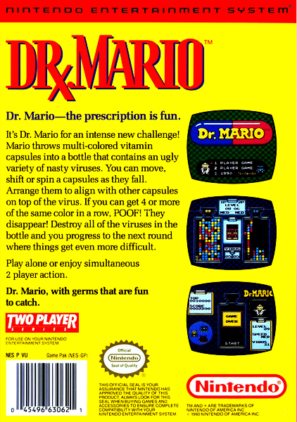 Nintendo created and released the puzzle video game Dr. Mario in 1990 for the Game Boy, Famicom, and Nintendo Entertainment System. It was created by Takahiro Harada and produced by Gunpei Yokoi. Hirokazu Tanaka wrote the music for the film.