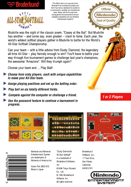 Dusty Diamond's All-Star Softball is a one- or two-player NES video game in which players can choose from a variety of fictitious softball players to create their own championship squad.
