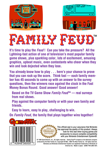 Family Feud (NES) is a family game developed by Beam Software. It was originally released in 1991. GameTek published the game. You can play Family Feud (NES) on NES.