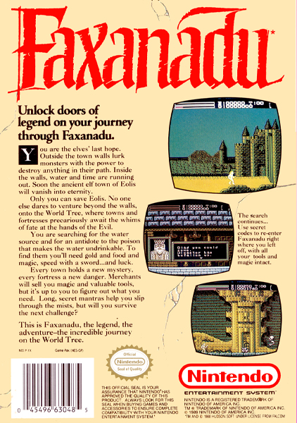 The Family Computer (Famicom) and Nintendo Entertainment System video game Faxanadu is an action role-playing platform adventure (NES). Nihon Falcom ("Falcom"), a maker of video games, granted Hudson Soft a license to use the brand, which the company created and distributed in Japan in 1987. Under license from Hudson Soft, Nintendo of America released the game in 1989 as a first-party title in the United States.