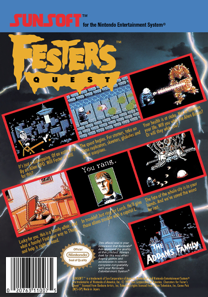 Fester's Quest (also known as Uncle Fester's Quest) is a video game for the Nintendo Entertainment System based on the 1960s television series The Addams Family. It was released in 1989 in North America and 1990 in Europe.