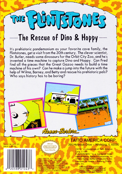 The Flintstones: The Rescue of Dino & Hoppy is a 1991 platform video game by Taito for the Nintendo Entertainment System based on the animated series The Flintstones. Taito later released another Flintstones game for the NES titled The Flintstones: Surprise at Dinosaur Peak.