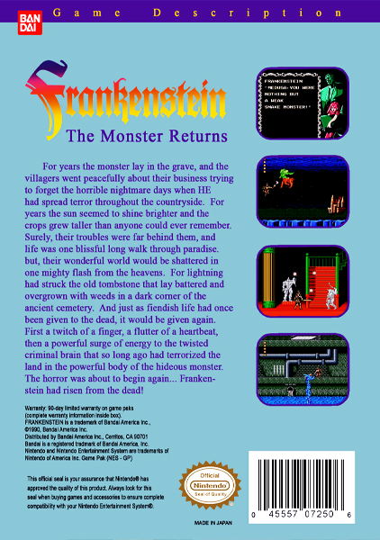 Frankenstein: The Monster Returns is a Nintendo Entertainment System action video game developed by Tose and published by Bandai in 1991 exclusively in North America.