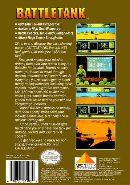 Battletank is a 1990 Nintendo Entertainment System first-person shooter game created by Absolute Entertainment and Imagineering. The game allows one person to operate a tank, similar to the Atari game Battlezone.