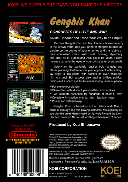 Genghis Khan, original full title Aoki Ōkami to Shiroki Mejika: Genghis Khan, is a 1987 turn-based strategy game developed by Koei, originally released for the NEC PC-9801, MSX and Sharp X68000 in 1988, the DOS and NES in 1990, and the Amiga in 1990.
