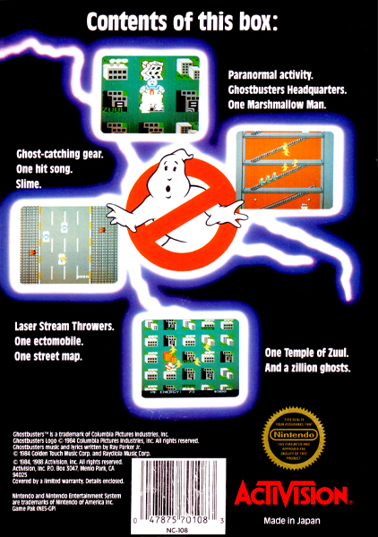 Ghostbusters is an Activision licensed game based on the film of the same name. It was created by David Crane and released in 1984 for numerous home computer platforms, as well as video game console systems such as the Atari 2600, Master System, and Nintendo Entertainment System.