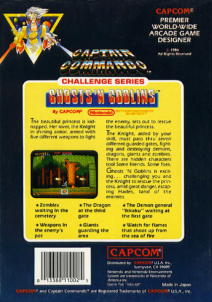 Ghosts 'n Goblins, known as Makaimura in Japan, is a 1985 arcade platform video game developed by Capcom. It was the original game in the Ghosts 'n Goblins series, and it has since been ported to a variety of home platforms. It was a huge commercial success in arcades and at home.