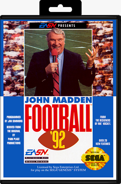 John Madden Football '92, released as Pro Football in Japan, is a football video game. It features John Madden on the cover. Madden Football '92 is the sequel to John Madden Football. New aspects of this version include instant replay, two-player cooperative play, quarterback injuries, review and overturn pass interference calls, and more audibles. There are also new play modes, such as pre-season games, regular season games, playoffs, and sudden death. Quarter lengths have been adjusted in this version to be set at 5, 10, or 15 minutes. As in previous versions of the video game, there are no NFL or NFLPA licenses for authentic teams, player names, and stadia. Teams are organized by city name and colors. MegaTech gave the game 95% and a Hyper Game Award, saying that "you'll enjoy it, even if you don't care much for the sport". In October 1992, Mega placed the game at #1 in their Top Mega Drive Games of All Time.