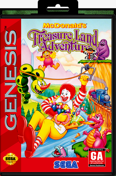 McDonald's Treasure Land Adventure is a platform video game created by Treasure for the Mega Drive/Genesis. Based on the McDonald's fast food franchise and four of its corporate mascots from McDonaldland (Ronald McDonald, Hamburglar, Grimace, and Birdie the Early Bird), the game follows the adventures of Ronald McDonald in an attempt to find four pieces of a treasure map, and ultimately, the treasure to which it leads.