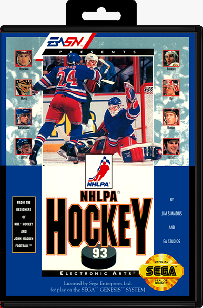 NHLPA Hockey '93 is a Sega Genesis and Super Nintendo Entertainment System ice hockey game developed by Park Place Productions and published by Electronic Arts Sports Network. It is the second installment of the NHL series and the first to be released for the Super NES. Although considered to be the second EA Sports NHL game, the game was not licensed by the NHL, however it did receive licensing permission from the NHLPA. Because of this all teams are referred to only by city with no use of the team name itself. Additionally, no NHL team logos or NHL emblems are seen anywhere in the game.