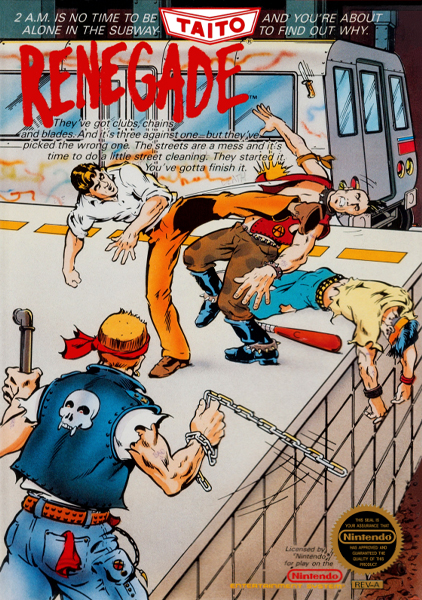 Taito launched Renegade as a video game in 1986. It is a westernized conversion (including changes to all of the graphics and backdrops) of the Japanese arcade game Nekketsu Kha Kunio-kun, which was released by Technos earlier that year. It is the technological forerunner to Double Dragon, and Nekketsu Kha Kunio-kun is the first game in the Kunio-kun series (which includes Super Dodge Ball and River City Ransom).