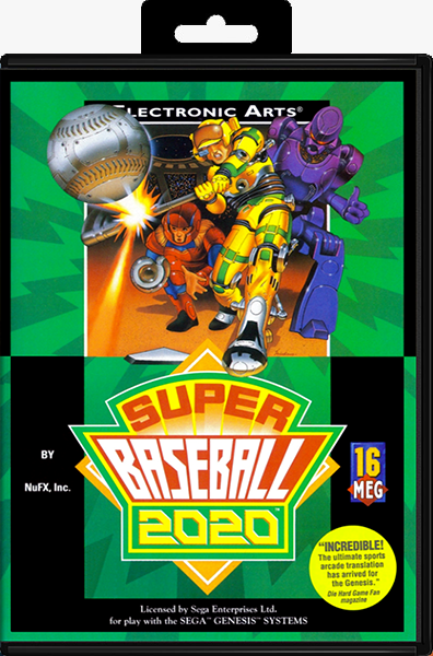Super Baseball 2020 (???????????????) is a futuristic baseball video game. It was first released in Japan for the Neo Geo in 1991, and then it was later released in North America for the Sega Genesis (ported by NuFX and released by Electronic Arts) and Super Nintendo Entertainment System (released by Tradewest) in 1993. The North American Genesis and European Mega Drive versions feature a package illustration by Electronic Arts artist Marc Ericksen. The game follows the basic rules of baseball, but there are several upgrades since the game takes place in the year 2020. The most obvious difference from real baseball is that some of the characters in this game are robots. All the human characters are equipped with powerful armor, computer sensors, and jet-packs for improved offense and defensive skills.