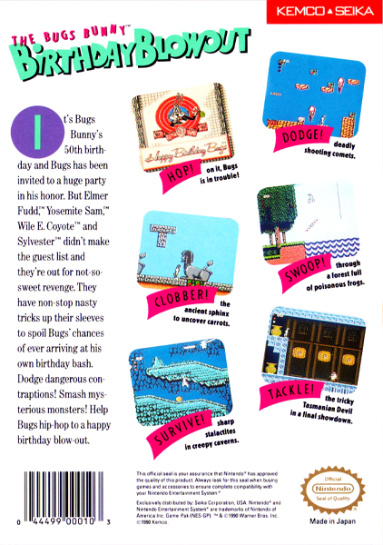 The Bugs Bunny Birthday Blowout, known in Japan and on the title screen as Happy Birthday Bugs and in Europe as The Bugs Bunny Blowout, is the title of a Kemco video game released for the Nintendo Entertainment System in 1990.